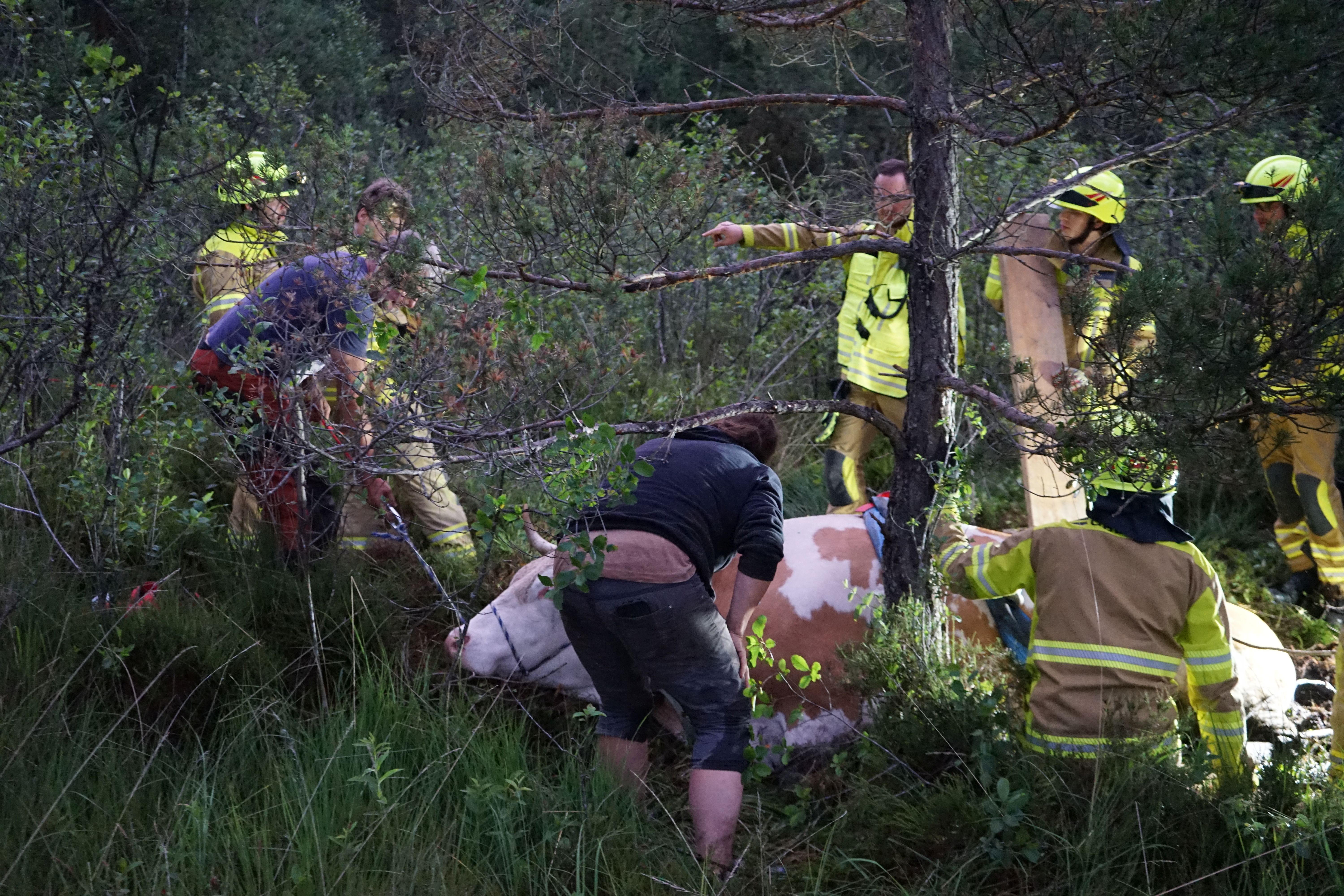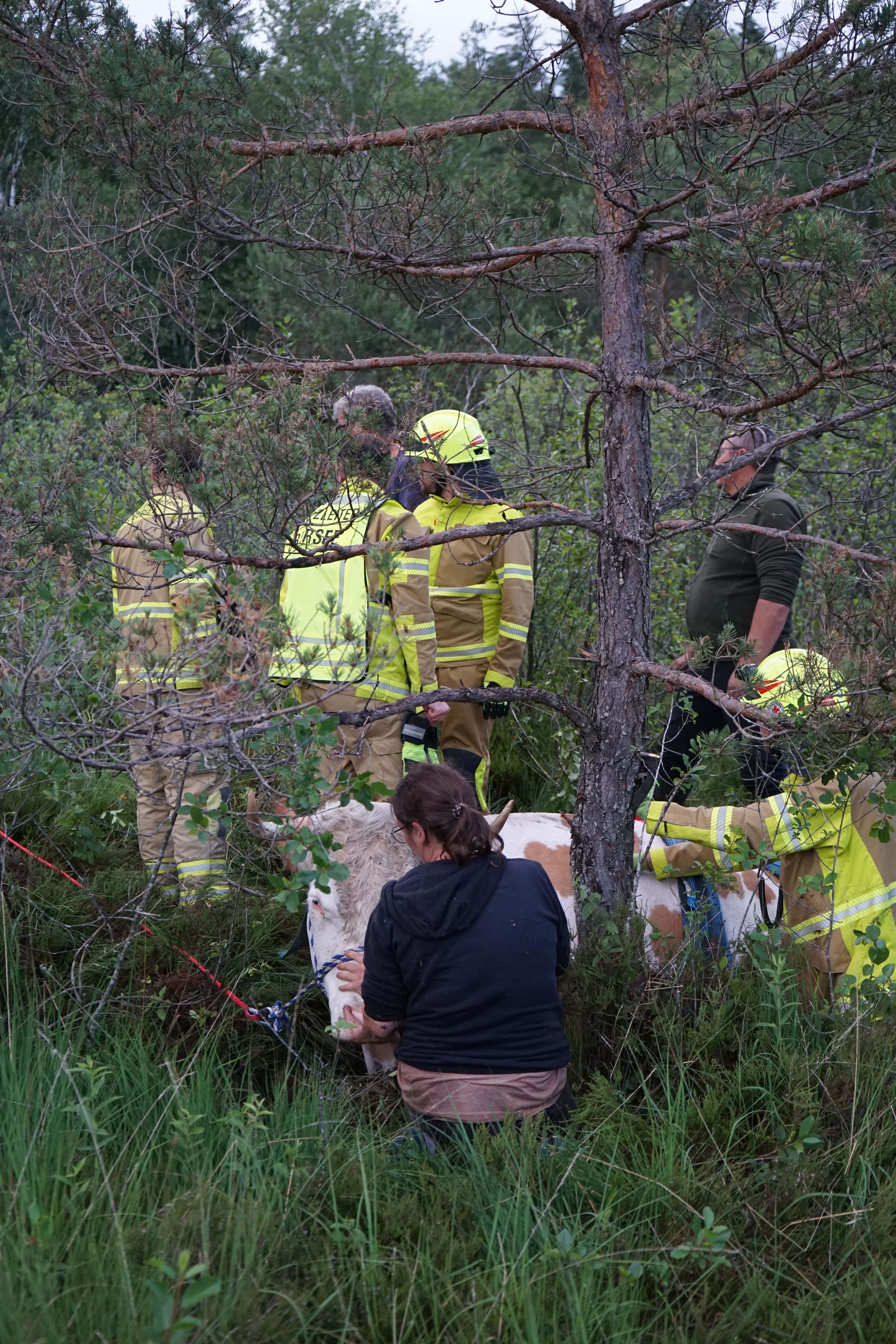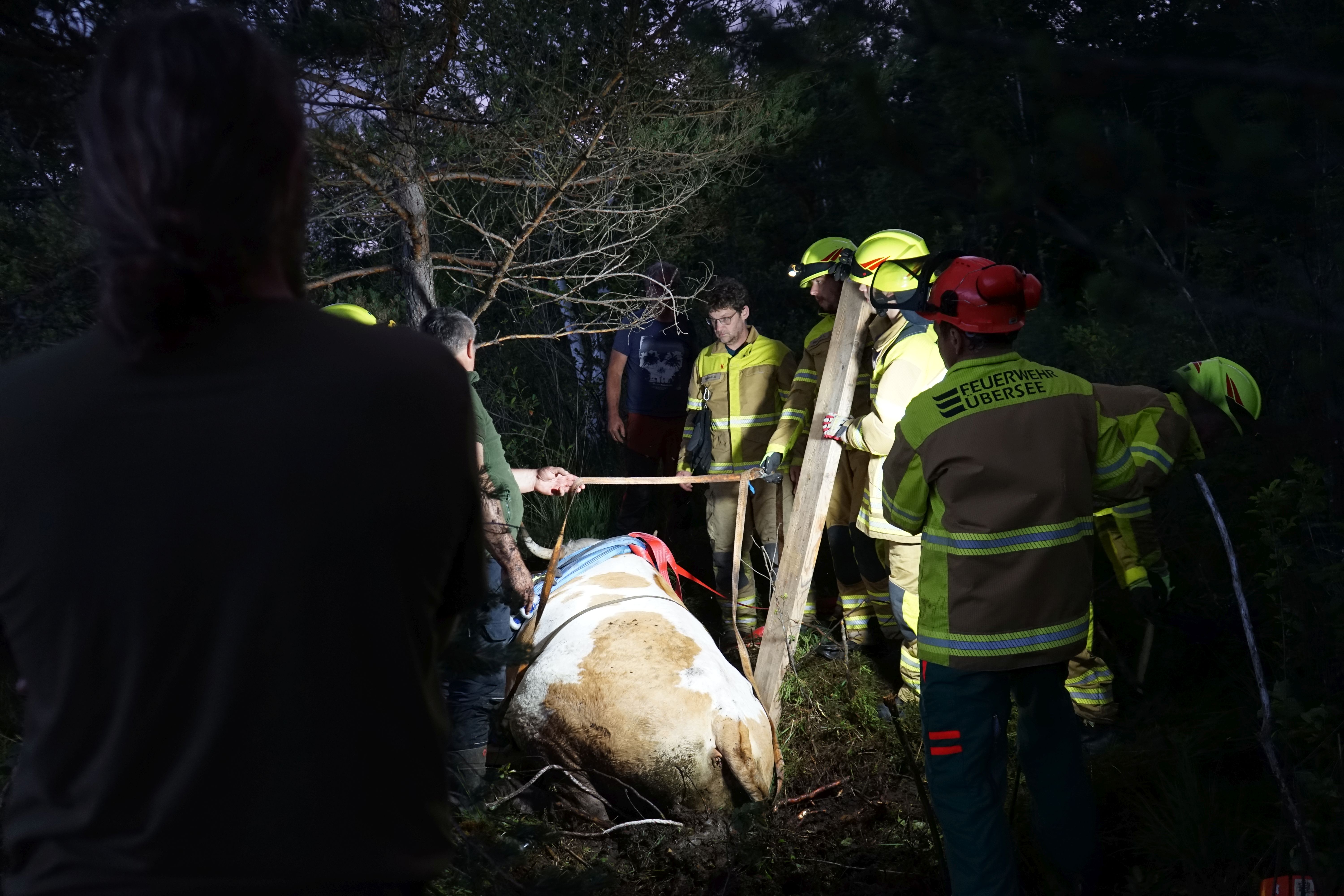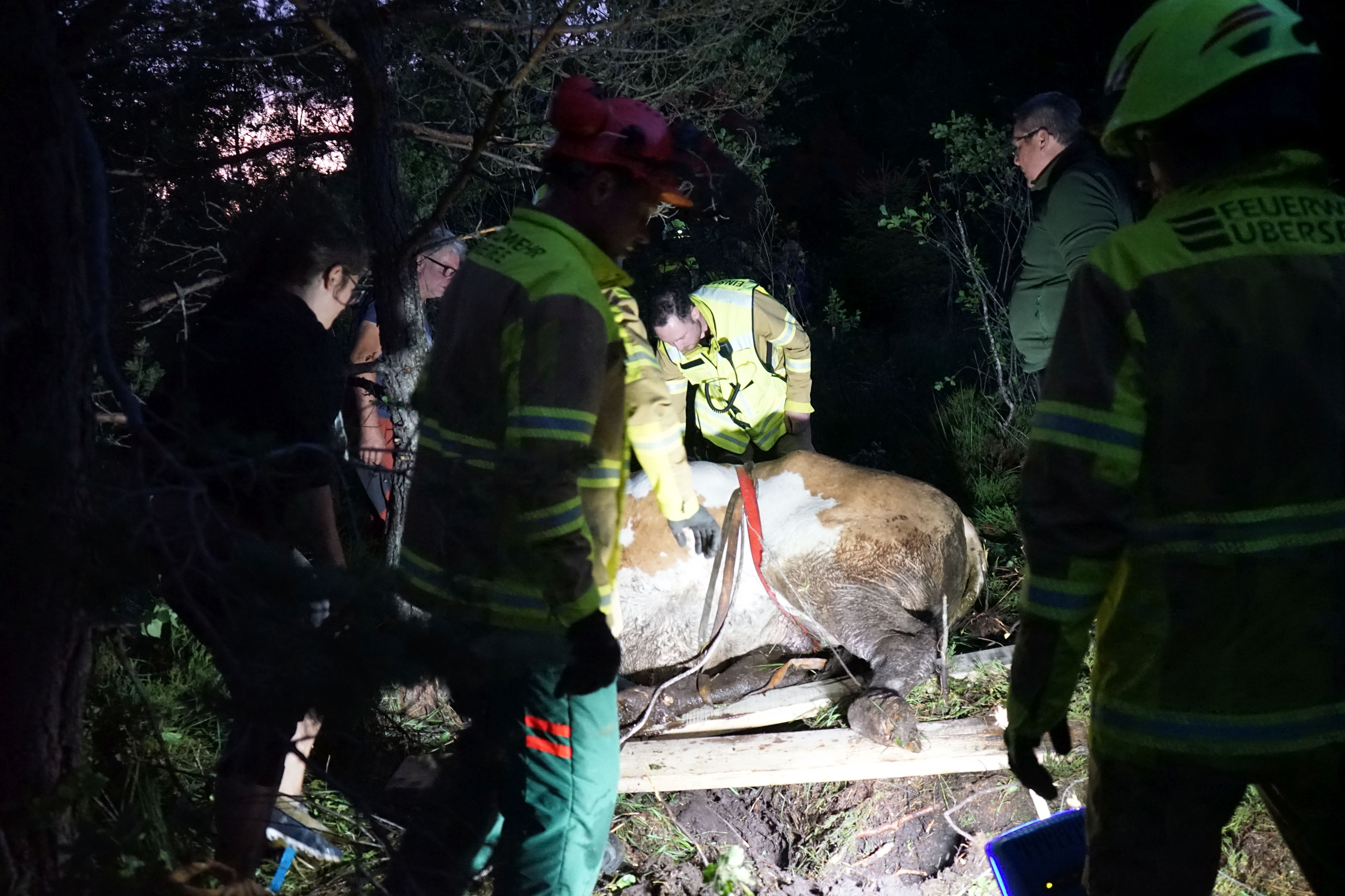 Bei Eintreffen am Schadensort wurde die Feuerwehr bereits von den Bauersfamilie sowie einem Tierarzt im Bereich des sogenannten Ewigkeitswegs in Empfang genommen und zum Ochsen „Berti“, der etwa 50 Meter neben dem Weg in einer Moorlichtung hüfttief versunken war, geführt. Aus dieser misslichen Lage konnte sich das 900 Kilogramm schwere Tier nicht mehr selbstständig befreien und war auf die Hilfe der Feuerwehr angewiesen.
