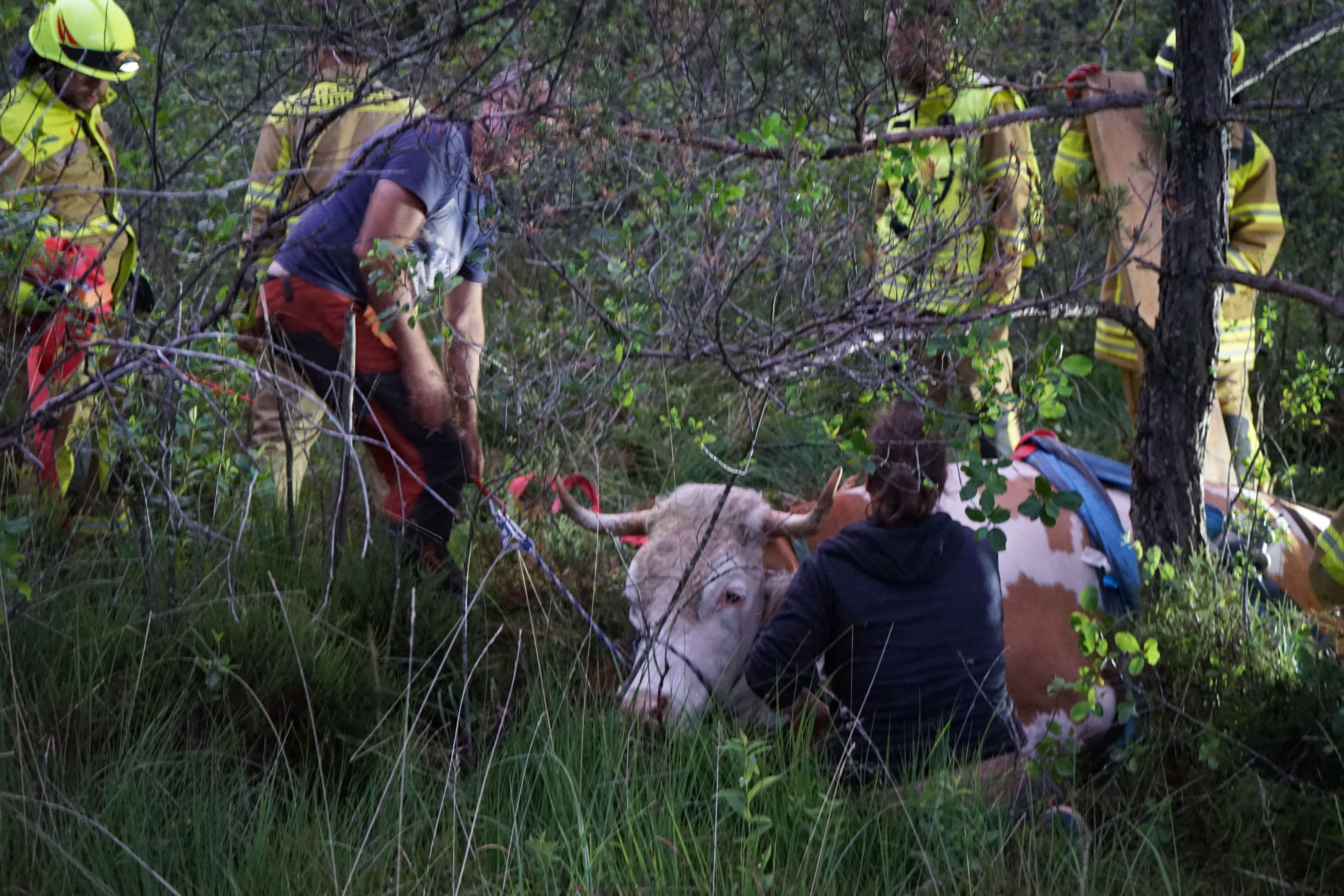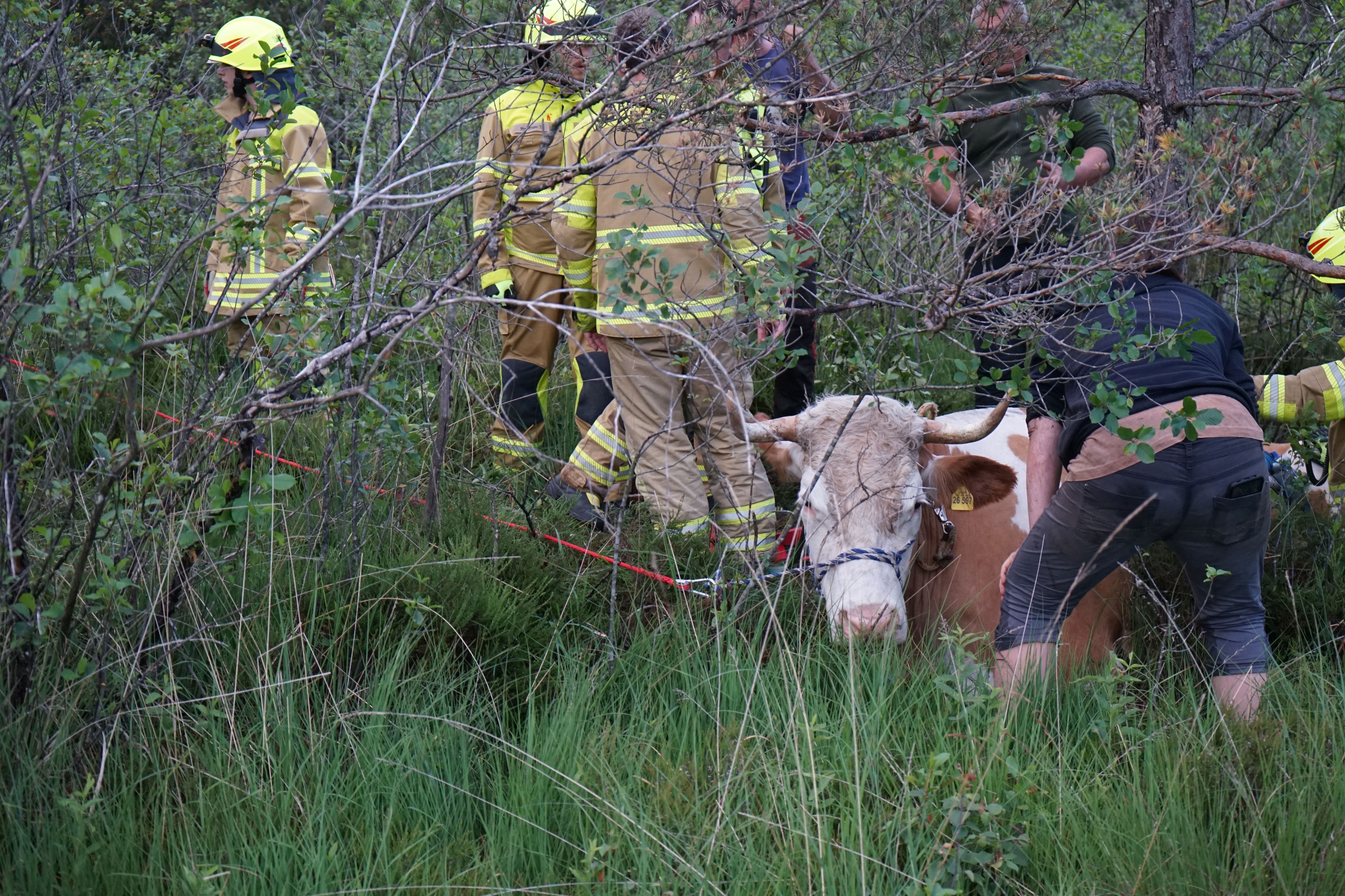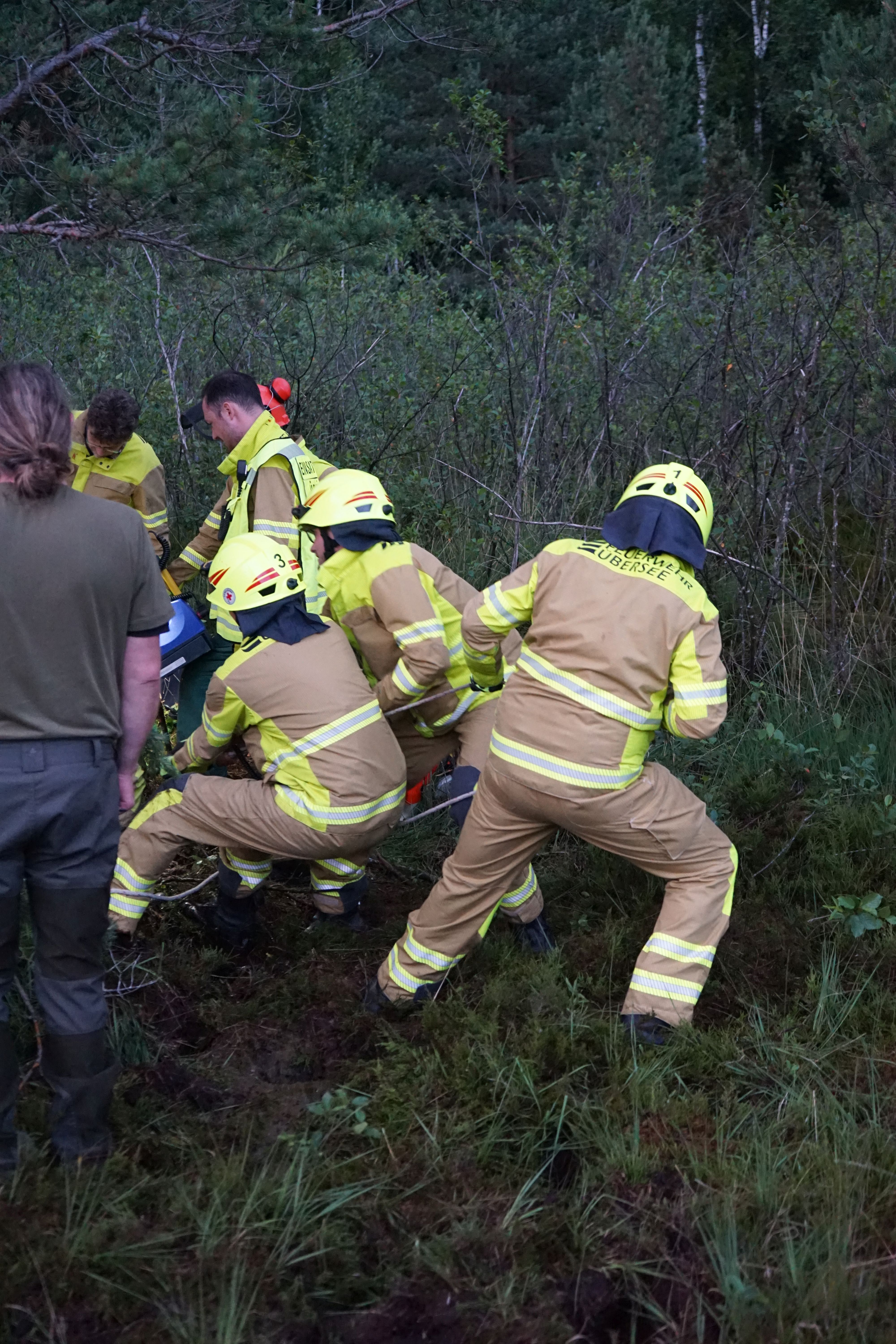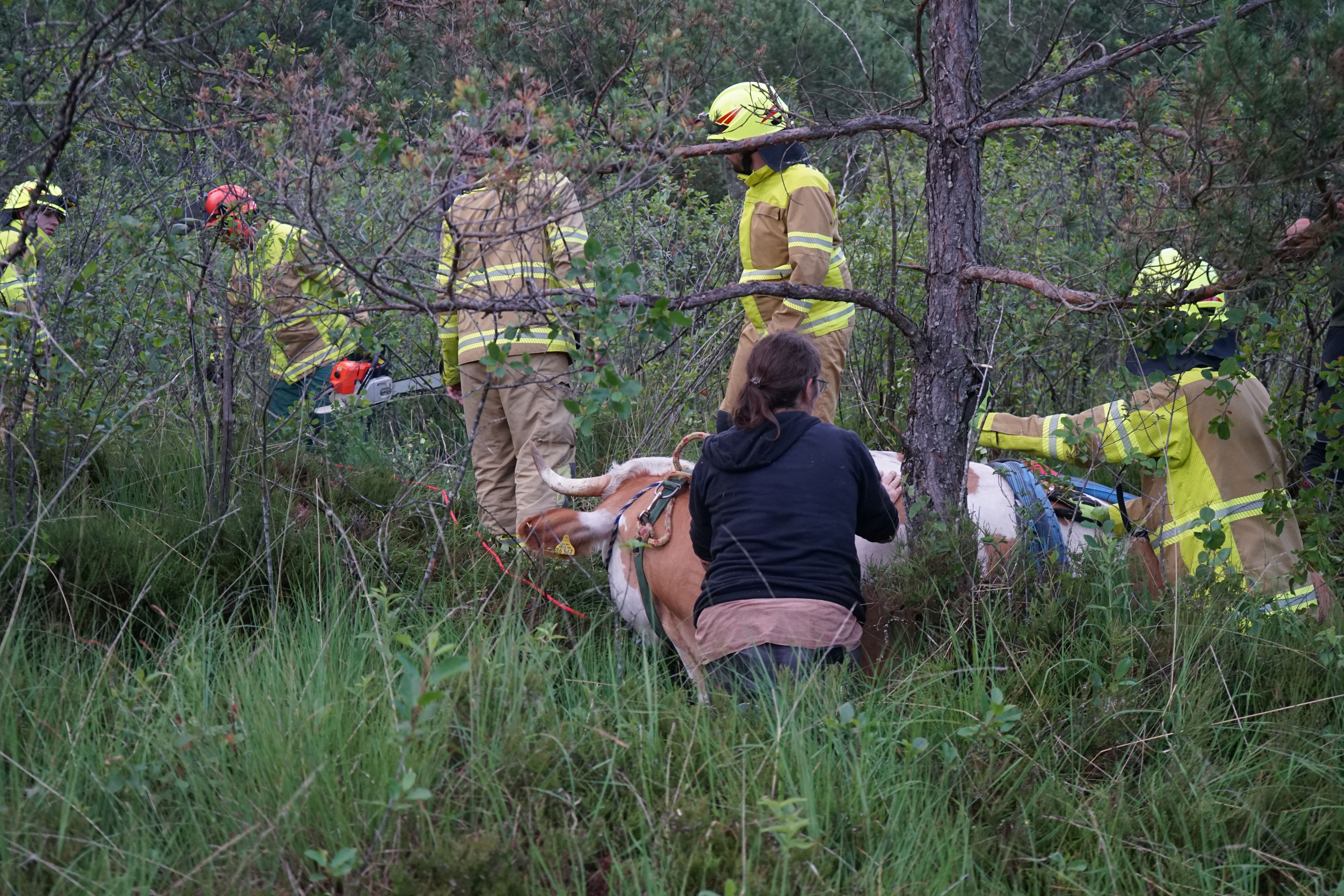 Bei Eintreffen am Schadensort wurde die Feuerwehr bereits von den Bauersfamilie sowie einem Tierarzt im Bereich des sogenannten Ewigkeitswegs in Empfang genommen und zum Ochsen „Berti“, der etwa 50 Meter neben dem Weg in einer Moorlichtung hüfttief versunken war, geführt. Aus dieser misslichen Lage konnte sich das 900 Kilogramm schwere Tier nicht mehr selbstständig befreien und war auf die Hilfe der Feuerwehr angewiesen.